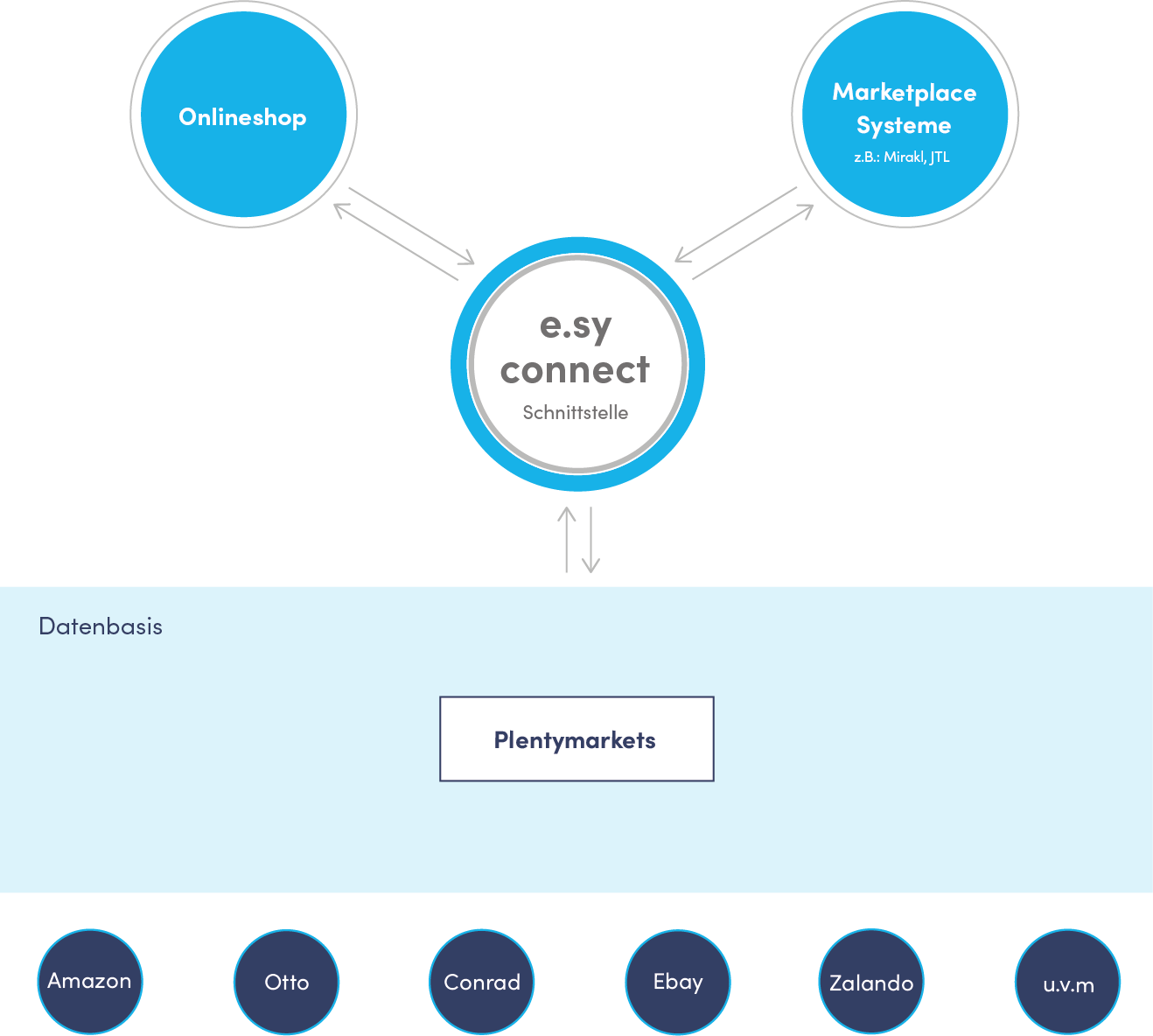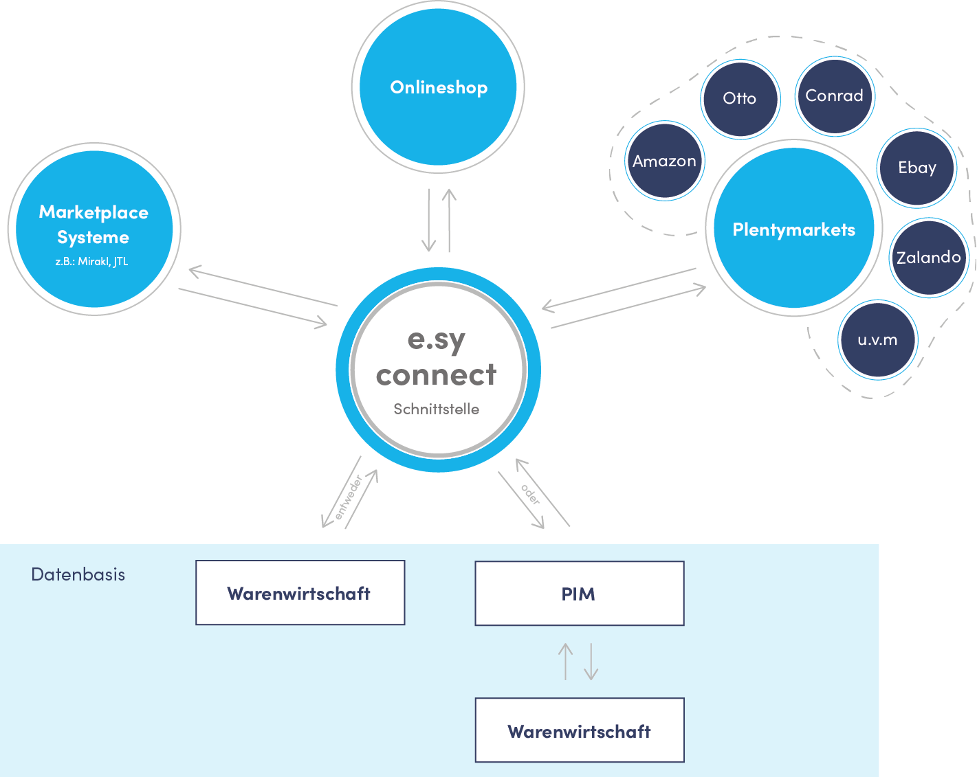 e.sy connect sorgt schnell und unkompliziert dafür, dass notwendige Produktdaten z.B. aus Ihrer Warenwirtschaft oder ihrem PIM für zahlreiche, unterschiedliche Online-Plattformen „aufbereitet“ und transferiert werden. Mit der Marktplatzanbindung Mirakl können weitere Marktplätze wie Conrac, Voelkner oder Home24 angesteuert werden.