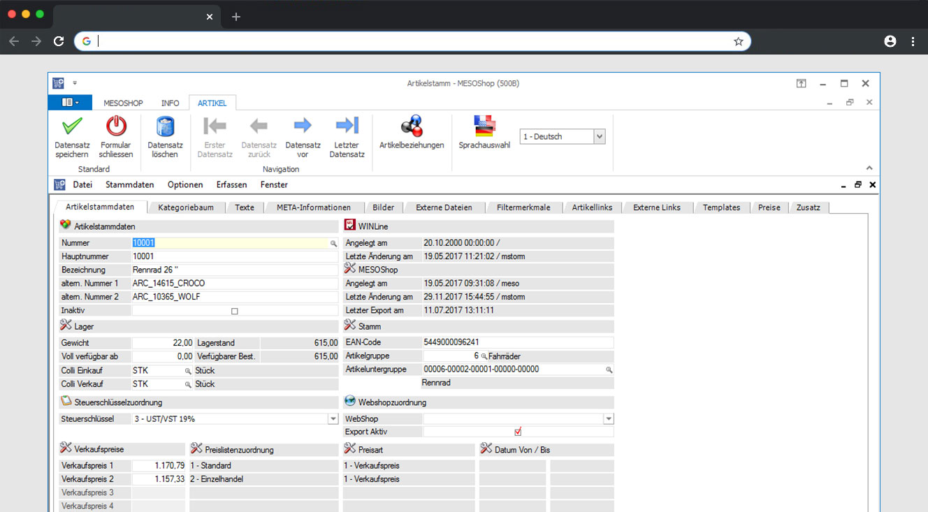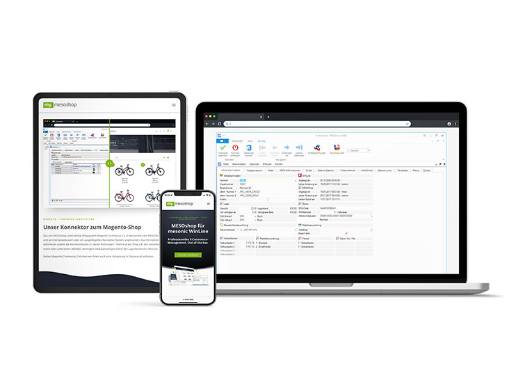 MESOshop verknüpft die relevanten Daten aus mesonic WinLine mit dem Shopsystem und bietet darüber hinaus die Möglichkeit, die Daten des WinLine-ERP beliebig zu erweitern und anzureichern. So können einzelnen Produkten oder Produktgruppen beispielsweise Artikelinformationen, Fotos, Bedienungsanleitungen oder notwendige Zertifikate problemlos zugeordnet werden.