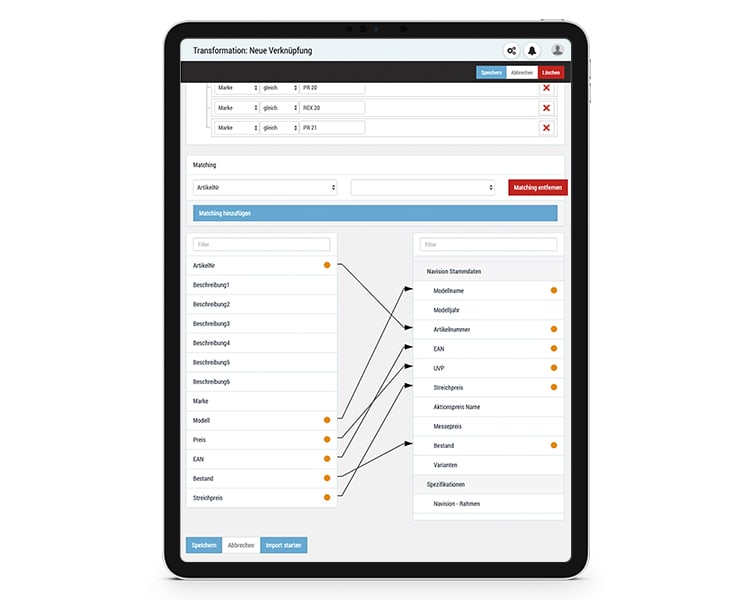 Mit einem integrierten Konnektor-System lassen sich Datenströme für unterschiedlichste Kanäle ganz einfach per Drag and Drop zusammenstellen. Je detaillierter und differenzierter der Aufbau Ihrer zentralen Datenbasis, desto einfacher das individuelle Konfigurieren sogenannter Daten-Strings.