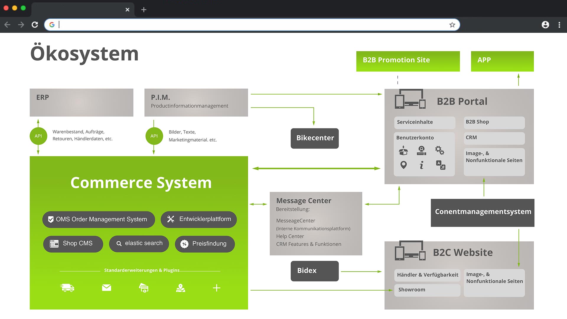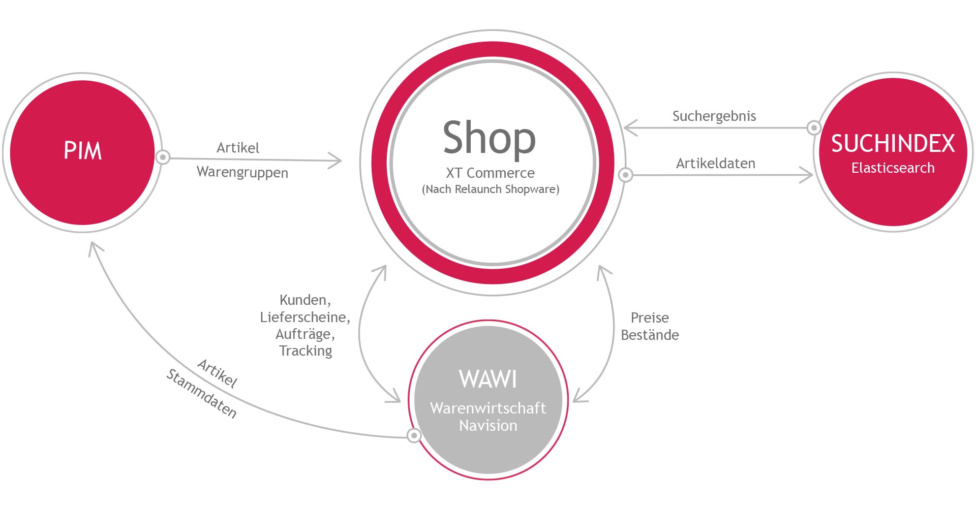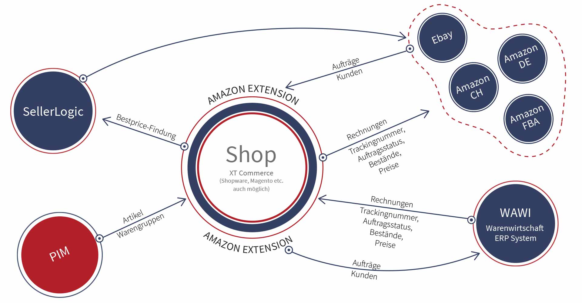 Ein systematisch geplantes, skalierbares E-Commerce-System berücksichtigt nicht nur den Status Quo Ihrer aktuellen Software-Umgebung (ERP, CRM), sondern antizipiert auch deren Weiterentwicklung. Kombiniert mit einem passenden Shopsystem und sinnvollen Erweiterungen wie ein PIM oder eine ausgeklügelte Suche, sind auch eine Internationalisierung oder die Anbindung an offene oder geschlossene Marktplätze (Amazon, Ebay, Google Shopping, Facebook Shop)  jederzeit unproblematisch realisierbar.