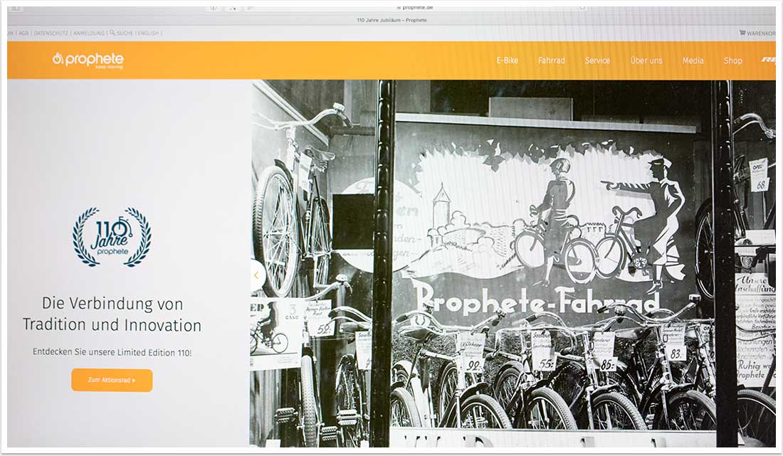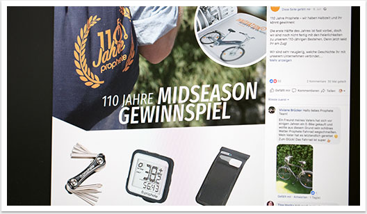 Im Web bestimmen eine eigene Microsite zum Jubiläum, ein Gewinnspiel zum Jubiläumsrad und Social Media Aktionen den Auftritt. Der Gewinn, ein eigens zum Jubiläum produziertes E-Bike, wird mit einem hochwertigen Hardcover-Buch zu den Unternehmenswerten geliefert.