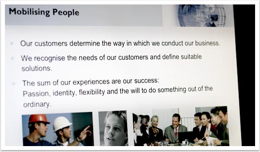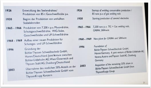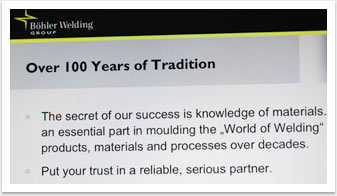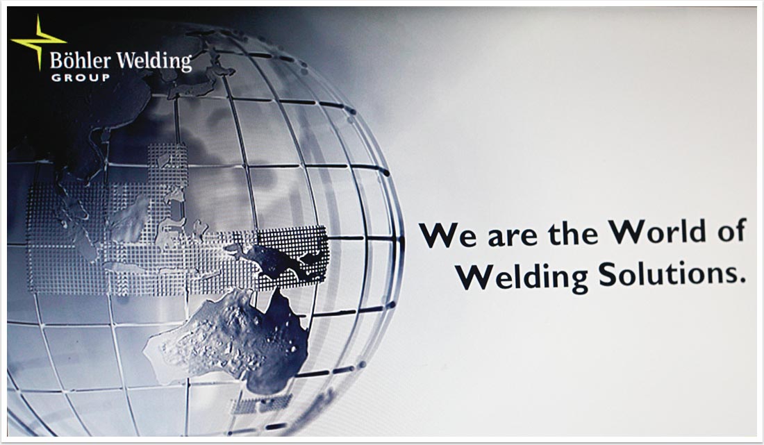 Die vorrangig englischsprachige Business-Präsentation wurde auf Basis des Unternehmensdesign der Böhler Welding Group gestaltet und umgesetzt. Aufgrund der hohen Informationsdichte der einzelnen Templates wurden zahlreiche Grafiken entworfen, die in Kombination mit emotionalen Bilderwelten und einem übersichtlichen Textanteil, Inhalte sinnvoll gebündelt abbilden. Die Image-Präsentation wird im gesamten Konzern deutschlandweit genutzt.