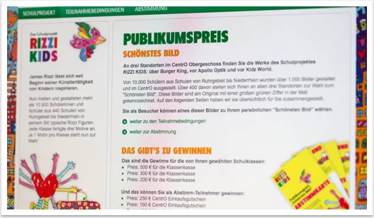 Über 10.000 Schülerinnen und Schüler aus 440 Klassen haben 2010 an dem einzigartigen, vom CentrO ausgeschriebenen Wettbewerb teilgenommen. Der New Yorker Künstler James Rizzi gilt als einer der weltbekanntesten Künstler der Kunstform Pop-Art. Für alle Teilnehmer war es eine besondere Ehre, die von Rizzi entworfenen Motive mit Farbe oder Foto neu zu erfinden. Bespielsweise fanden die von dem Amerikaner erfundenen “Rizzi Birds” großen Anklang und wurden mit der Kreativität der Kinder in eigene kleine Pop-Art-Kunstwerke verwandelt. Per Online-Abstimmung wurden die Gewinner-Klassen ermittelt, die bis zu 1000 Euro für die Klassenkasse gewinnen konnten.
