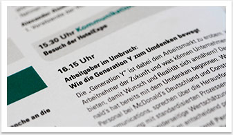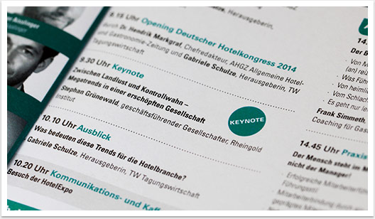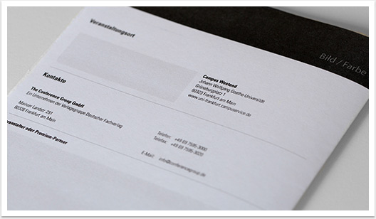 Ziel war die Vereinheitlichung der Kongresskommunikation auf verschiedensten Ebenen und ein praktikabler Design-Baukasten für die Grafik-Abteilungen des Deutschen Fachverlages. Die zukünftige Gestaltung sämtlicher Printmedien sollte die eindeutige Identifikation des Absenders „dfv Conference Group“ gewährleisten und dennoch möglichst viel Spielraum für die Besonderheiten einzelner Veranstaltungsreihen eröffnen.