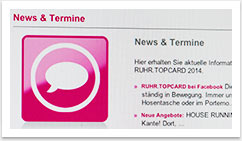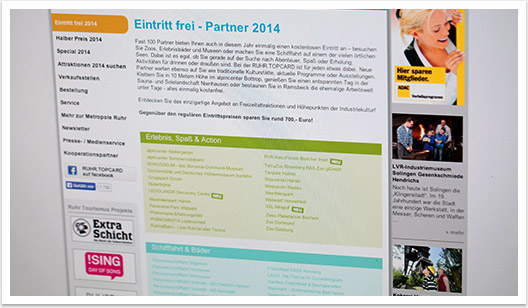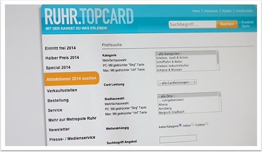 bgp e.media betreut die Internetseite für die RUHR.TOPCARD seit mehr als 5 Jahren. Basierend auf dem e.sy CMS bietet es den Mitarbeitern eine kinderleichte Administration und Aktualisierung aller Inhalte. Alle Informationen zu den Freizeitzielen und den damit verbundenen Card-Leistungen können über eine relationale Suchfunktion abgefragt und gefunden werden. Zudem erhält der Website Nutzer alle notwendigen Informationen zur Bestellung und Nutzung der RUHR.TOPCARD.