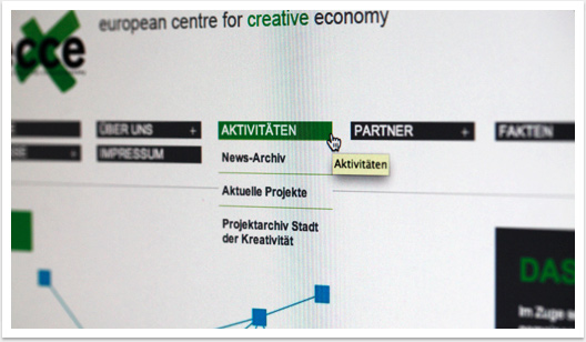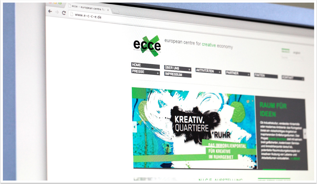 e.c.c.e. im Netz – feines Design für die Kreativwirtschaft in NRWIm echten Leben wohnt ecce in schicken Räumlichkeiten im neu gestalteten Dortmunder U. Virtuell geht es neuerdings nicht minder stylish zu. Reduziertes Design, schlichte Funktionalitäten und einfache Handhabung bei der Pflege des neuen Internetauftritts – das waren die Vorgaben der RUHR.2010-Nachfolgesellschaft unter Dieter Gorny und Bernd Fesel.