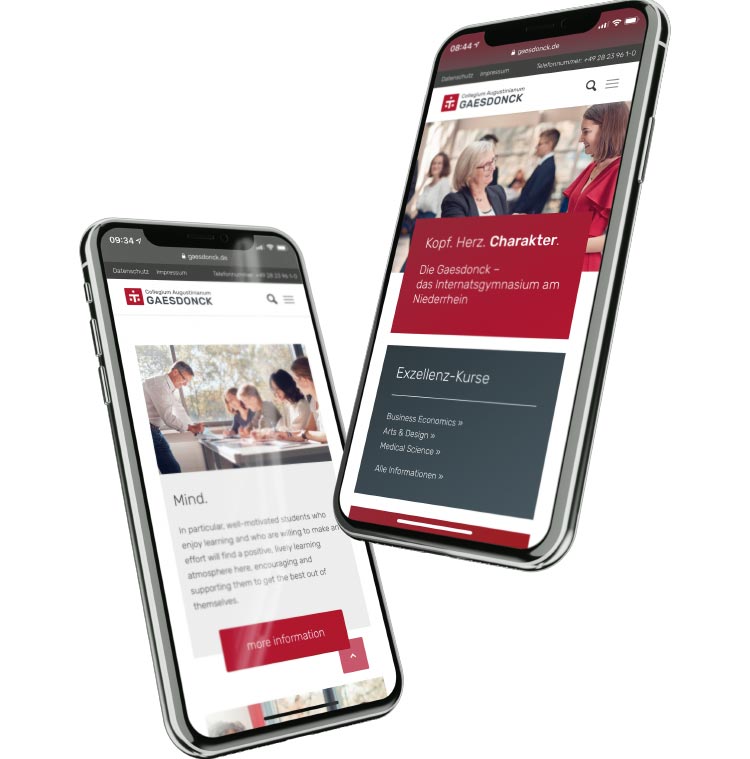 Da der Auftritt für alle Schüler und Schülerinnen sowie deren Eltern als tagesaktuelle Info-Plattform für alle Belange des Schulalltags dient, muss der Auftritt sämtliche Informationen auch auf Smartphones und Tablets vollständig vorhalten. Die responsive Gestaltung unter Beachtung von Mobile-first hat sich bewährt – die Besuchsdauer der Seiten ist selbst auf mobilen Endgeräten außergewöhnlich hoch.