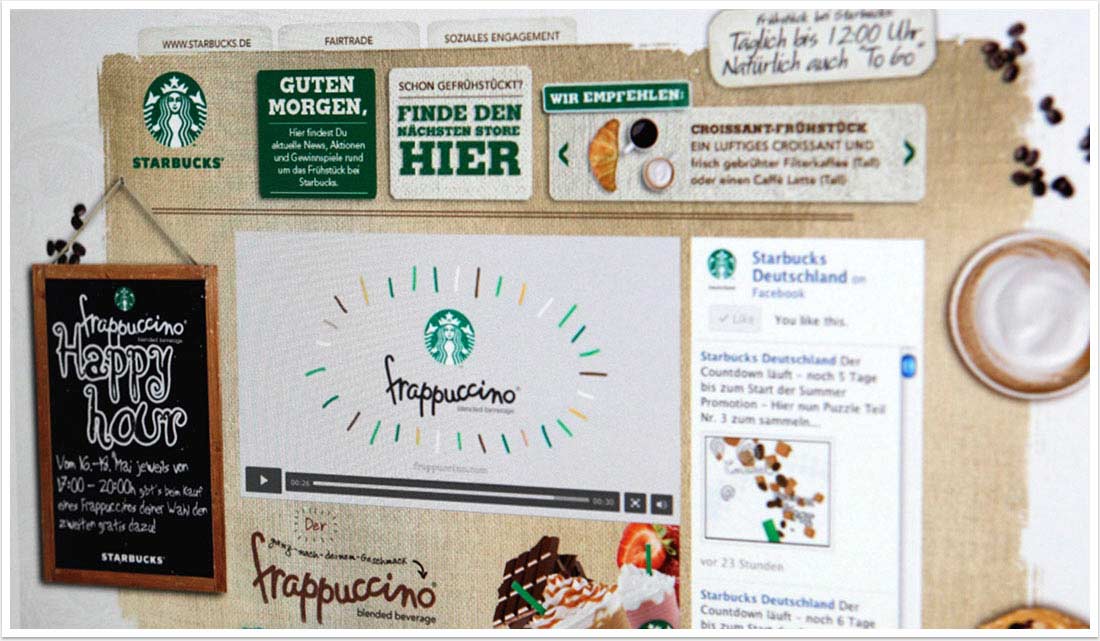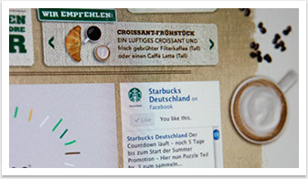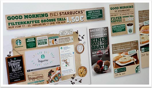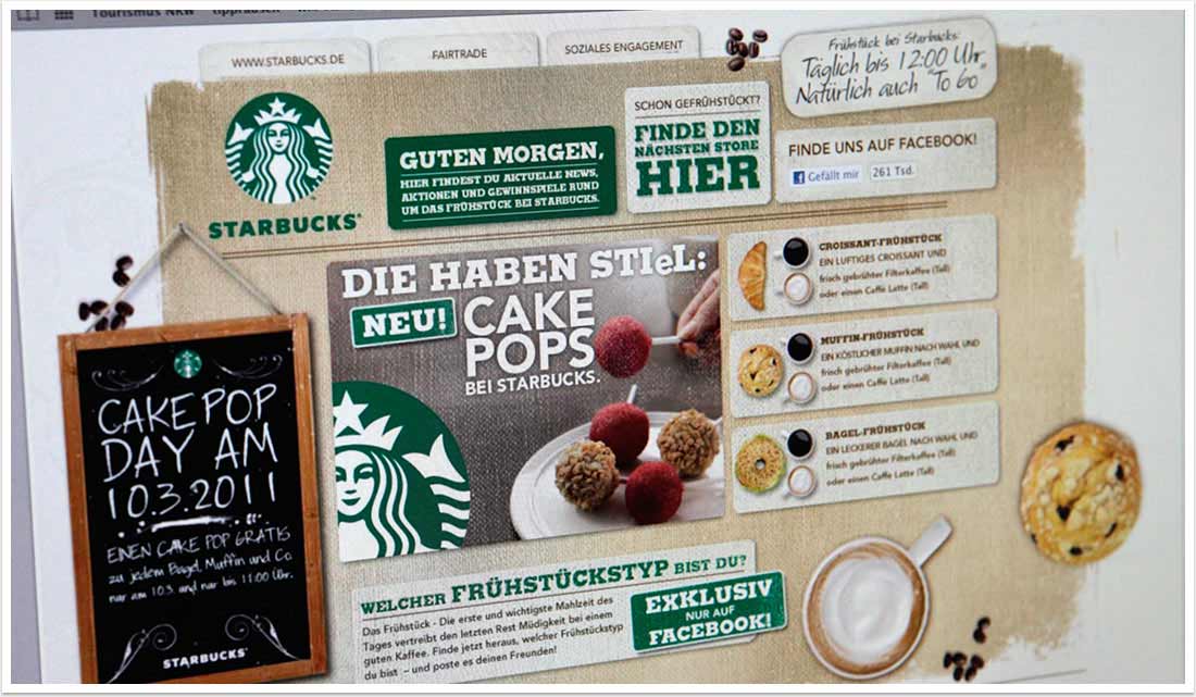 Starbucks’ Social Media Kampagne – Onepager mit “Hallo-Wach”-Effekt.Gemeinsam mit Benning, Gluth & Partner hat bgp e.media die Special-Interest-Site “Good Morning Starbucks” des weltweit führenden Anbieters, Rösters und Vermarkters von Spezialitätenkaffee in Form eines Onepagers umgesetzt. Die B2C-Microsite wurde zur Promotion von Frühstücks- & Bundle-Angeboten samt flankierender Banner-Kampagne realisiert. Begleitet wurde die Kampagne von einer korrespondierenden facebook Fanpage inkl. eigener Facebook App.