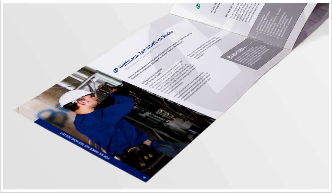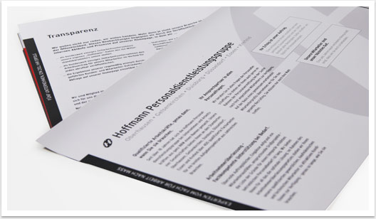 Thema Arbeitnehmerüberlassung – Kommunikation für mehr Vertrauen.Zeitarbeit ist Vertrauenssache, und dass sowohl für nachfragende Unternehmen als auch für das zu einzusetzende Personal. Die von uns gestaltete Imagebroschüre des Unternehmens erklärt eindrucksvoll, warum Hoffmann Zeitarbeit ein kompetenter und in jeder Hinsicht vertrauenswürdiger Partner für Unternehmen und Mitarbeiter ist.