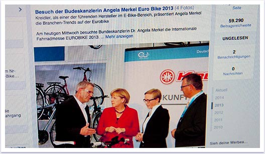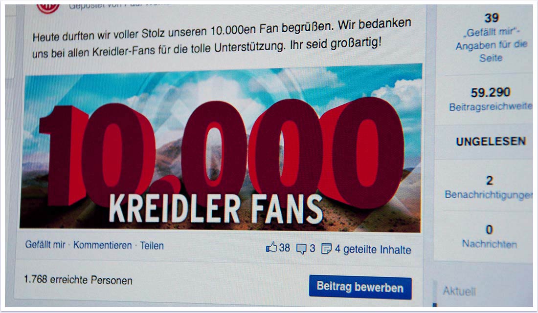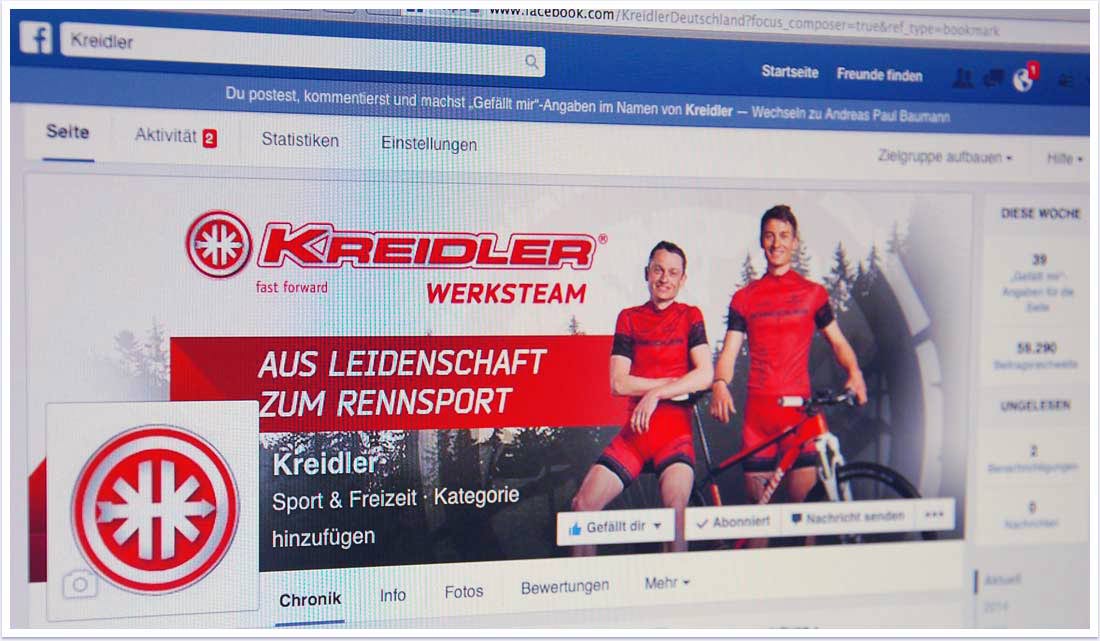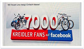Für das Social Media Engagement der Marke Kreidler hat bgp e.media nun auch die redaktionelle Betreuung übernommen und konnte innerhalb von einem Jahr einen Zuwachs von etwa 10.000 Facebook Fans verbuchen. Die ständige Präsenz, sei es durch Gewinnspiele, detailierte Produktinformation oder die Nähe zum Profi-Radsport, zeigte auf beeindruckende Weise wie Social Media Marketing funktioniert.