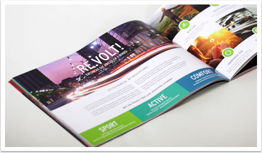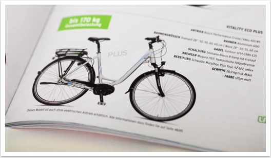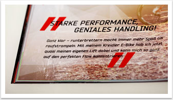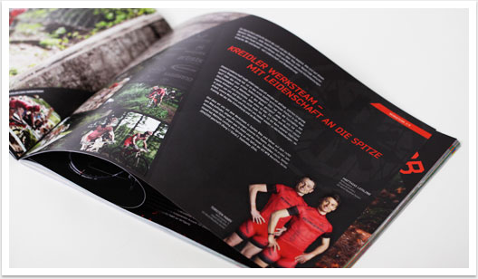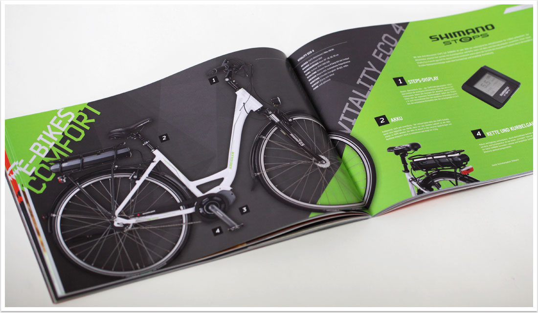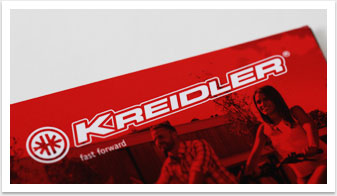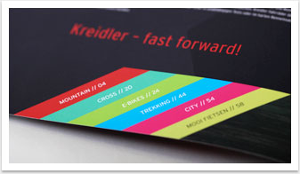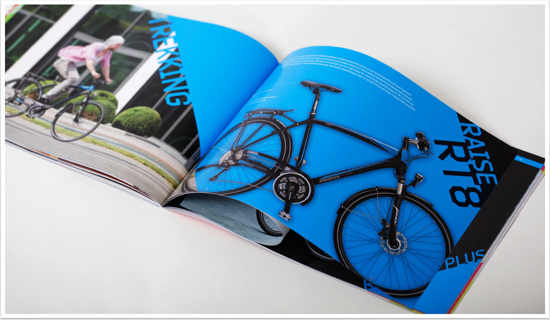 Der Produktkatalog aus dem Hause Kreidler präsentiert sämtliche neue Fahrrad- und E-Bike-Modelle der Saison 2015 und wartet mit einem neuen Designkonzept auf. Im Gegensatz zur schlichten Präsentation der Räder im vergangenen Jahr vermitteln das Bild- und Produkt-Composing in der aktuellen Broschüre eine innovative Dynamik, die dem neuen Image der Kreidler-Bikes gerecht wird. Mit dem Ausbau der E-Bike-Thematik liegt ein Fokus für die kommende Saison zudem auf dem Thema Elektromobilität. Neue Markenkonzepte, wie das E-Bike Webspecial, werden in Text und Bild auf gelungene Weise aufgegriffen und integriert.