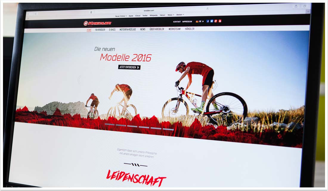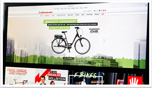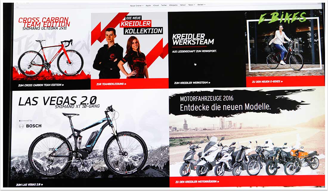 Das neue modulare Webdesign findet zunächst auf der Homepage und auf den Landingpages der Produkt-Kategorien seinen Einsatz. Weiter Inhalte und Seiten werden folgen. Zentrale Themen, wie der neue Modellkatalog für 2016, neue Top-Produkte oder die Microsite des Kreidler Werksteams werden nun prominenter und gezielter kommuniziert. Darüber hinaus setzt das neue Design auf großformatige Bildwelten mit Parallax-Elementen, die das neue Selbstbewusstsein der Marke unübersehbar transportieren.