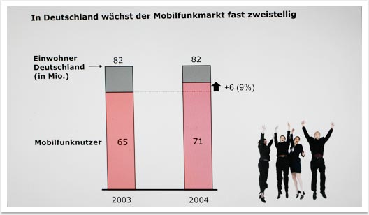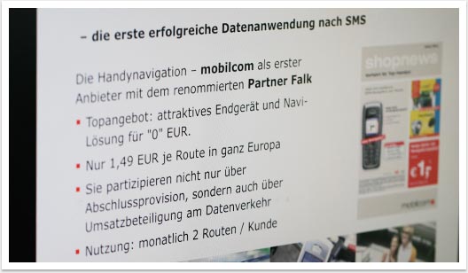 Anlässlich einer Tagung im Januar 2005 beauftragte mobilcom bgp e.media mit der Erstellung einer PowerPoint-Präsentation für sämtliche stattfindende Tagungspunkte und Vorträge. Mit Hinblick auf den großen Informations- & Textanteil auf den einzelnen Folien wurden die Templates in einem dezenten und schlichten Design gestaltet. Die weit über 100 Seiten fassende Präsentation enthält vielfältige Grafiken und Bildbereiche, welche den Informationsgehalt sinnvoll unterstützen.