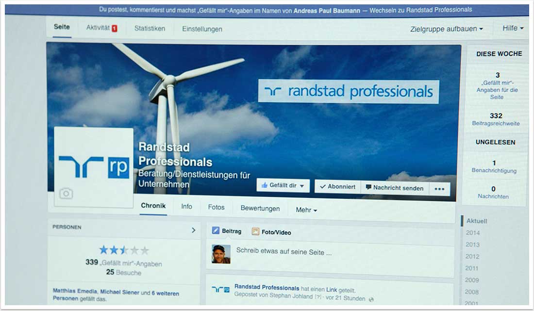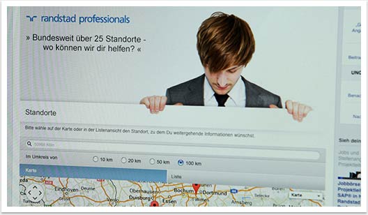 Nicht nur nützliche Informationen sondern auch topaktuelle Jobangebote finden interessierte Besucher auf den Facebook-Profilseiten von randstad professionals. Im Rahmen der Multichannel-Online-Strategie wurde die Facebook-Unternehmensseite von bgp e.media mit praktischen Funktionen realisiert. So wurde beispielsweise der Jobfinder mit Freitextsuche und diversen Filterfunktionen ebenso wie die einfache Navigation zu allen Standorten des Unternehmens per Schnittstelle zur Unternehmens-Website integriert.