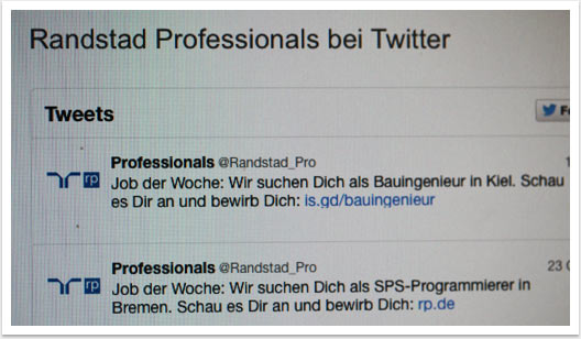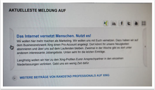 Der Social Media Newsroom wurde von bgp e.media in den bestehenden Internetauftritt von randstad professionals integriert. Die Bündelung aller Social Media-Aktivitäten der unternehmenseigenen Social Media Kanäle facebook, Twitter, Kununu, Xing sowie YouTube wurde über modifizierte Schnittstellen auf einer Seite ermöglicht.