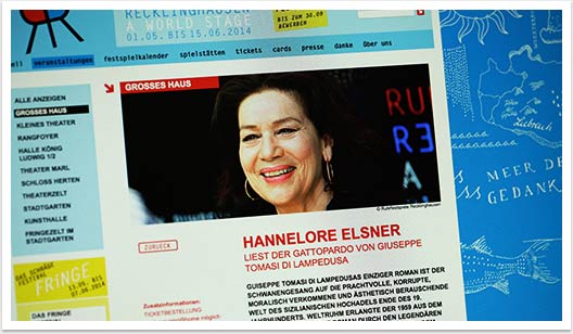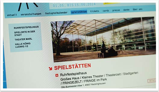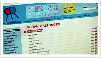 Website in neuem Design – ein zeitgemäßer Internetauftritt für die RuhrfestspieleAlljährlich verwandelt sich Recklinghausen in der Zeit vom 1. Mai bis Mitte Juni in eine wahrhaft internationale Kulturmetropole. Die Ruhrfestspiele sind nicht nur das älteste sondern zugleich eines der größten und renommiertesten Theaterfestivals in ganz Europa. Inszenierungen namhafter Regisseure, Darbietungen preisgekrönter Schauspielgrößen sowie Aufführungen junger Talente der Theaterszene verbinden sich in und um das Ruhrfestspielhaus zu einem runden Gesamtkonzept.