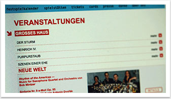 bgp e.media zeichnet verantwortlich für Konzeption, Screendesign und Umsetzung des Internetauftritts der Ruhrfestspiele. Die auf Basis unseres CMS e.sy programmierte Website verfügt über ein Stücke- bzw. Veranstaltungsmodul, das die zentrale Pflege aller relevanten Inhalte in verschiedenen, für das Haus individualisierten Pflegemasken ermöglicht. Adaptiv programmierte Templates ermöglichen die Einbindung verschiedenster Medien (z.B. Fotos, Videos, Videolinks). Die Kalendervorschau mit Such- & Filterfunktionen bietet einen übersichtlichen Überblick über die Vielzahl an Veranstaltungen. Selbstverständlich verfügt der Internetauftritt auch über einen Pressebereich, ein Newsletter-Modul sowie eine Volltextsuche.