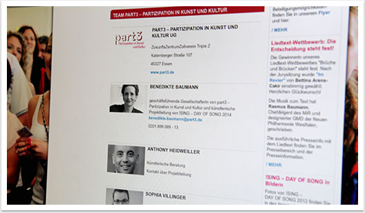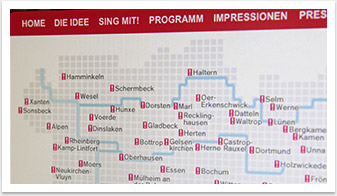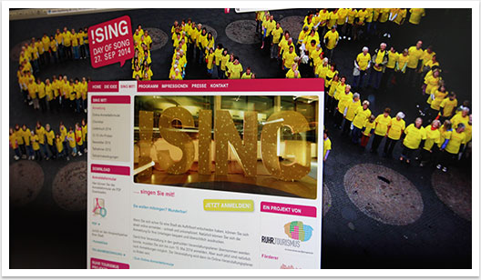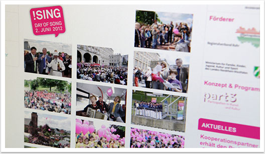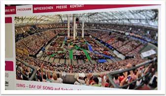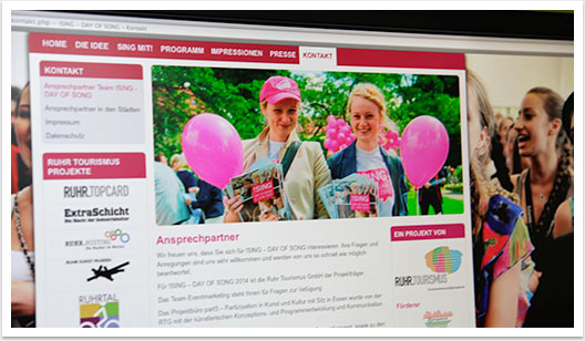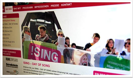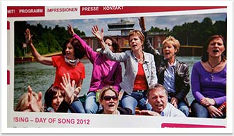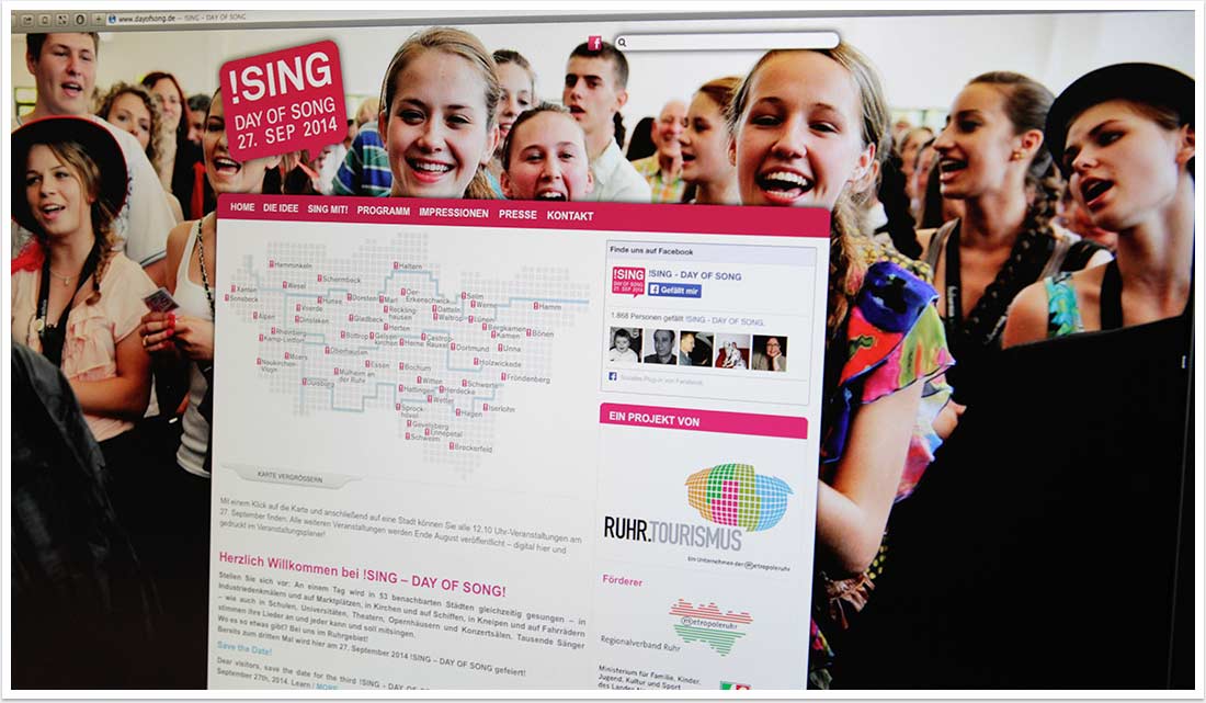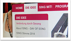 Die von bgp e.media gestaltete und programmierte Website zur Koordination und Publizierung des „Day Of Song“ für mehr als 480 Projektbeteiligte, Chöre, Gruppen und Organisatoren kann über das e.sy CMS nicht nur redaktionell gepflegt sondern im Sinne eines Customer Relation Management Systems auch entsprechend administriert werden. Das implementierte Ticketbuchungssystem ermöglicht den Online-Erwerb von Tickets für die einzelnen Veranstaltungsorte.
