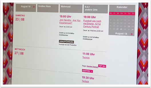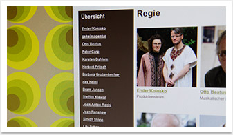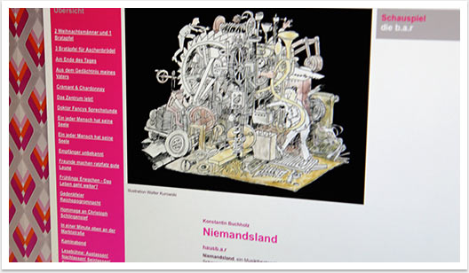 Theater-Website in ausgefallenes Design im CMS e.sy Mit Konzeption, Screendesign und Umsetzung betraut, wählten wir für den Relaunch der Website des Theater Oberhausen ein Design, das so vielseitig ist, wie das Haus selbst: Ein Random-Design-Generator wählt bei jedem Besuch einen zufälligen Hintergrund aus, gleichzeitig werden automatisch per Skript korrespondierende Designelemente und Stylesheets aufgerufen.