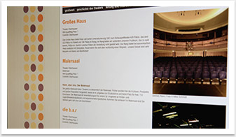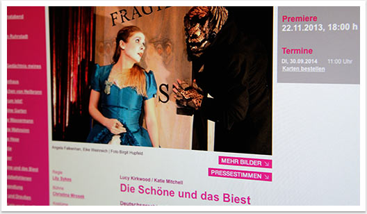 Die Pflege ist dank unseres bgp e.media eigenen CMS e.sy kinderleicht: individualisierte Pflegemasken ermöglichen eine schnelle Überarbeitung des kompletten Seitencontents, was den Bedürfnissen des Theaters mit zwei mal im Jahr wechselnden Schauspielzeiten entspricht. Die Templates ermöglichen dabei die Einbindung verschiedenster Medien (z.B. Fotos, Videos, Videolinks); ebenso gibt es ein Medien-Center für Videos, welches das Hochladen eines Videos aber auch die URL-Einbettung bspw. von Bildern, Soundaufnahmen oder Youtube-Videos erlaubt.