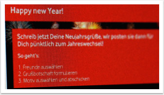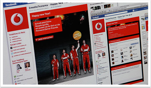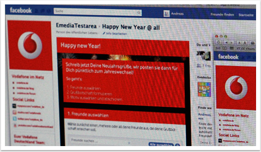 Wer hat es nicht schon erlebt? Man will zur Neujahrswende Nachrichten verschicken, doch aufgrund des überlasteteten Telefonnetzes treffen diese erst am nächsten Tag ein. Die von bgp e.media für Vodafone aufgesetzte facebook-Aktionsseite “Happy New Year” samt zugehöriger App nahm sich genau dieses Problems an. Per facebook-App konnten Vodafone-Kunden schon Tage vor dem Jahreswechsel ihre Neujahrsgrüße für ausgewählte Freunde verfassen, welche dann automatisiert, pünktlich um Mitternacht, gepostet wurden.