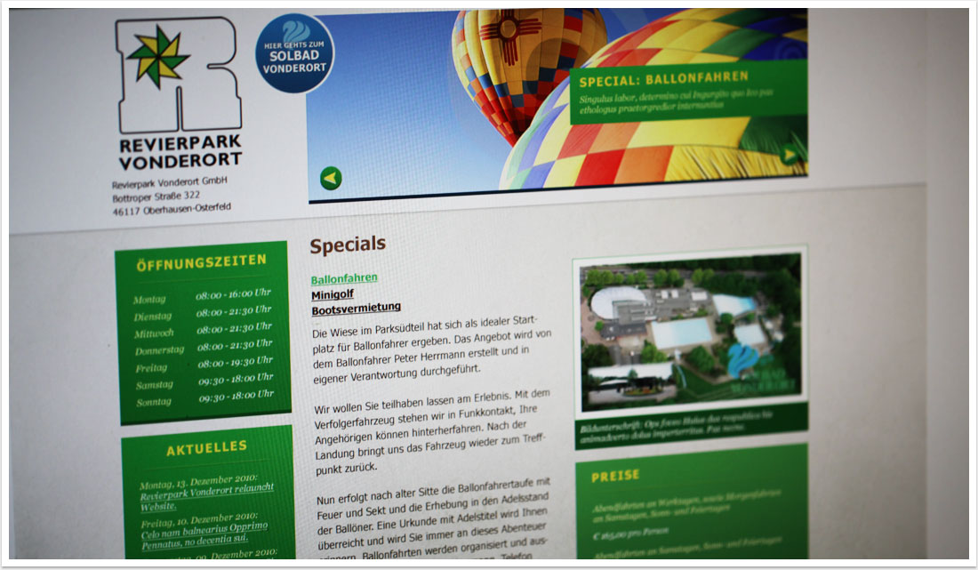 Internetauftrirtt und Webdesign für lokalen Revierpark Vonderort by bgp e.media - Contentinhalt Specials