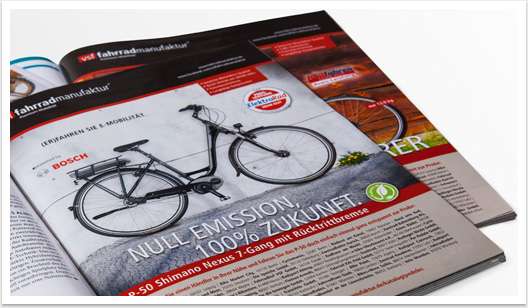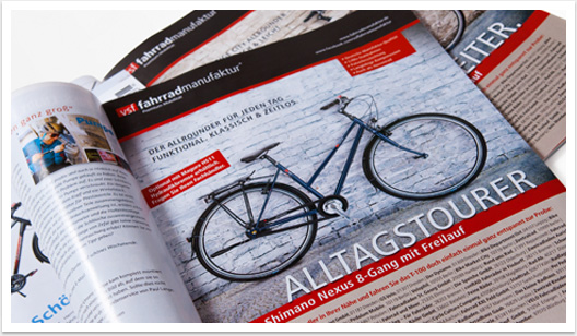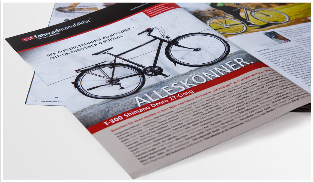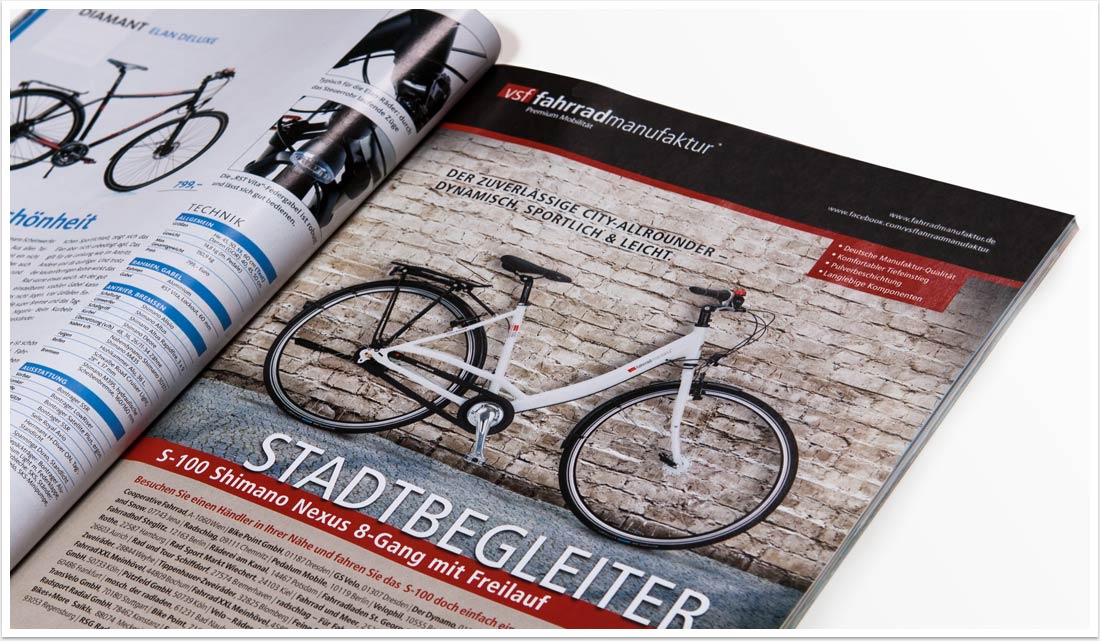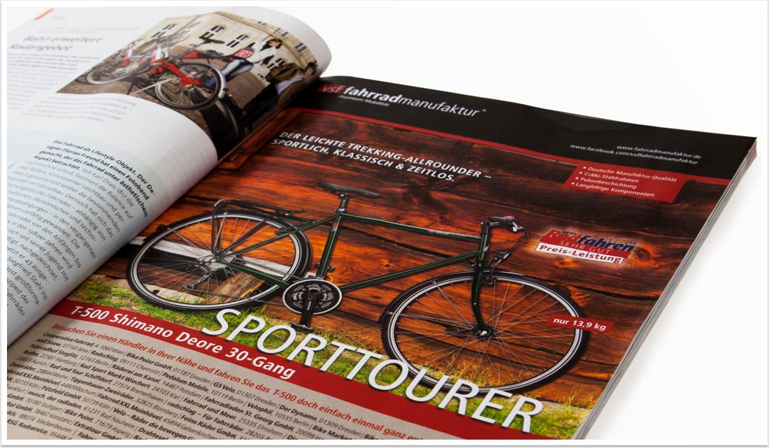 Aufgrund der Zielgruppen-Definition erfolgte die Platzierung der ganzseitigen Händler-Anzeigen in reise- und tourenaffinen Rad-Magazinen. Dort arbeiten die Motive mit knackigen Einwort-Slogans wie „Stadtbegleiter“, „Alltagstourer“ oder „Alleskönner“ und zusätzlichen Informationen über qualitativ hochwertige Ausstattungsmerkmale.